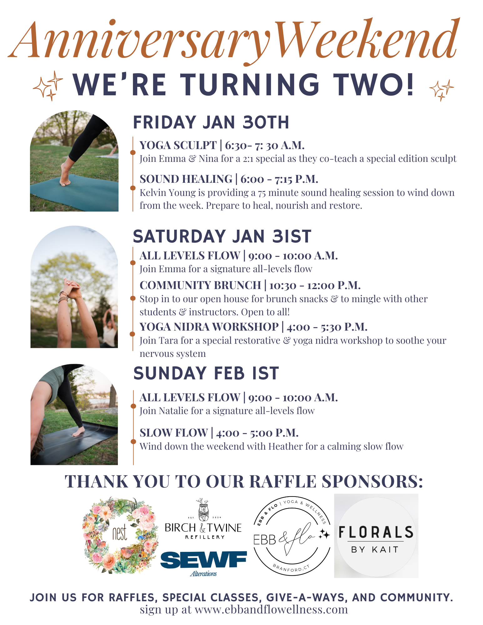 Join us for our anniversary (birthday) weekend as the studio turns TWO! We are so grateful for all that the last two years have brought and cannot wait to continue building, connecting, breathing and moving with you.